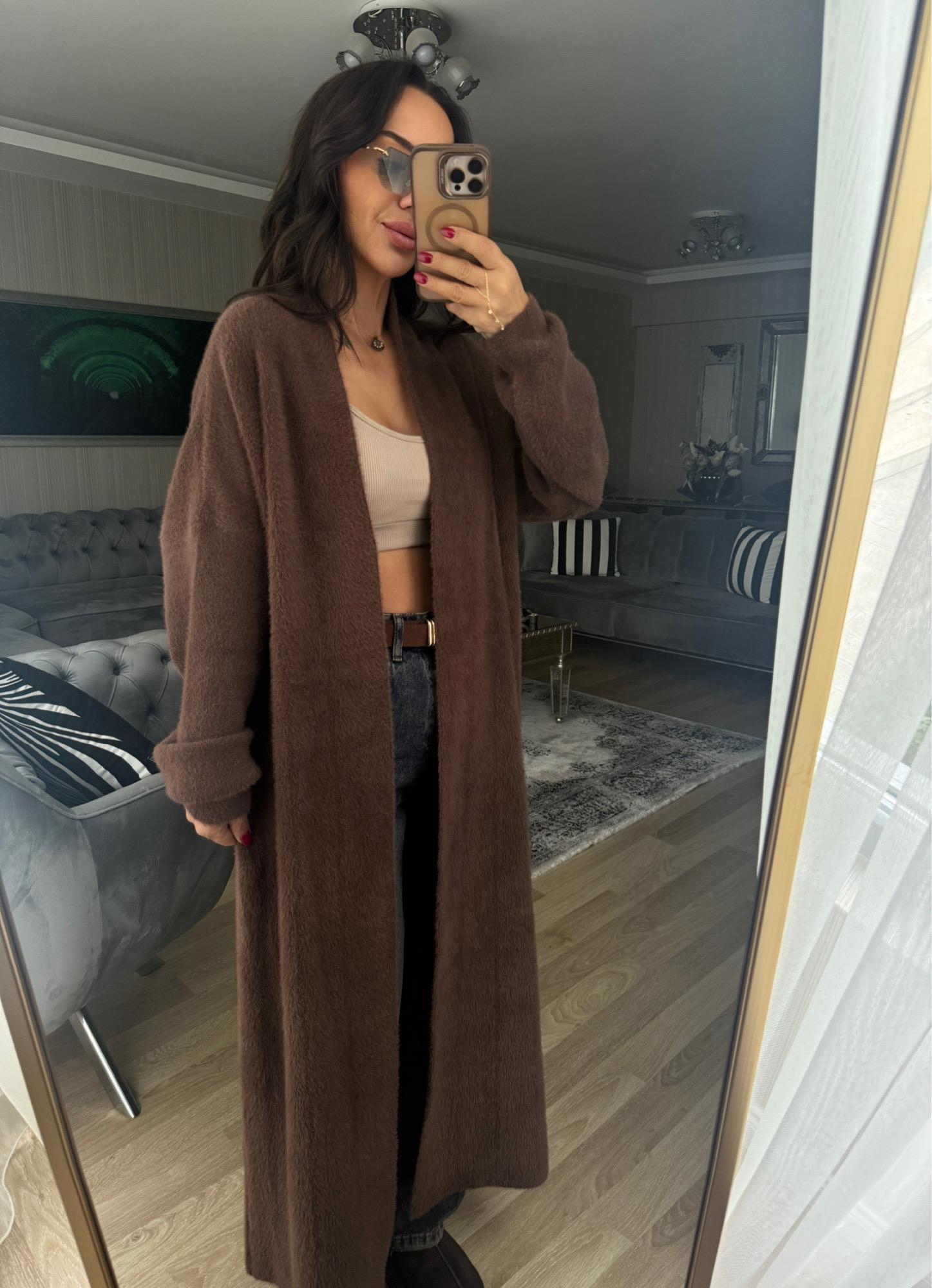 RİMA Kahverengi Angora Maxi Boy Hırka